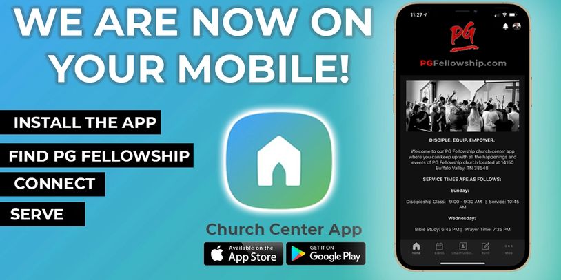 PG Fellowship is now on your mobile. Simply go to your phone's app store, download "Church Center", find PG, connect, and serve! It's that easy.